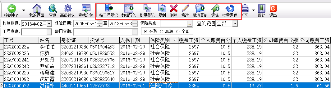 可批量登記,或者外部excel導入,也可從上月復制,退保可批量退保;