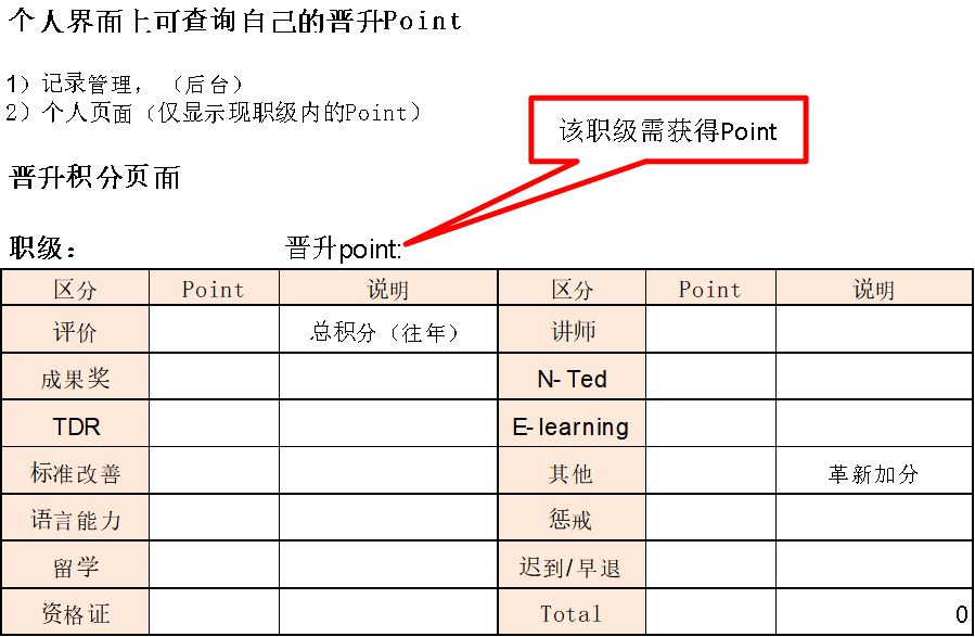 2.定義每個(gè)關(guān)鍵職位的任職標(biāo)準(zhǔn),如社員升為主管需要多個(gè)任職年限,需要多少考核指求點(diǎn),可以追溯往年的所有考核指標(biāo)項(xiàng)目,現(xiàn)將該企業(yè)的職位升職資格表附下圖: