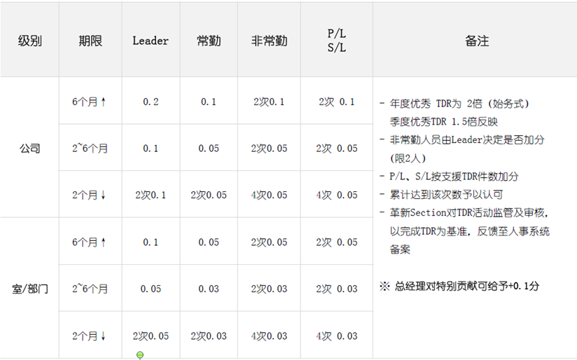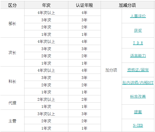 3.定義了七個(gè)職級(jí)的任職審核年限標(biāo)準(zhǔn),每個(gè)職級(jí)劃分為1年、2年、3年、4年及4年以上的認(rèn)證年限,并定義了每個(gè)職級(jí)的加減分項(xiàng):人事評(píng)價(jià)、獲獎(jiǎng)、TDR、語言能力、資格證/留學(xué)、社內(nèi)講師/內(nèi)部OJT、標(biāo)準(zhǔn)改善、提案、N-TED等方面的考核加減分項(xiàng);對(duì)必要資格定義如下:革新學(xué)校結(jié)業(yè)(在職期間需通過1次即可),且為學(xué)校結(jié)課時(shí)排名為參與人員的前10%,加分處理為第1名:0.1分;第2名:0.05分;而科長升為次長:TOPIK需要2級(jí)以上;次長升部長:TOPIK需3級(jí)以上;附圖為任證年限標(biāo)準(zhǔn):