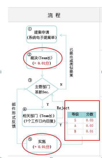 6.個(gè)人工作完成了,培訓(xùn)的工作也做好了,那如何保證一個(gè)好的制度的傳承,不好的制度能及時(shí)修正與改正呢?下面關(guān)于晉升的的一個(gè)關(guān)鍵考核項(xiàng)目就是對(duì)之方面的一個(gè)強(qiáng)力保證,就是你關(guān)于制度的建議要有提案,要形成企業(yè)管理文件并歸檔,對(duì)企業(yè)制度的建立與完善要有貢獻(xiàn),我們來看看該企業(yè)的提案流程與對(duì)應(yīng)的晉升加分