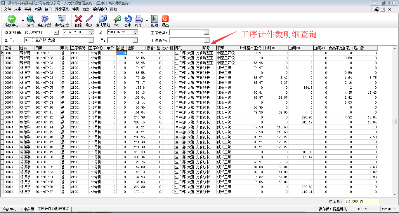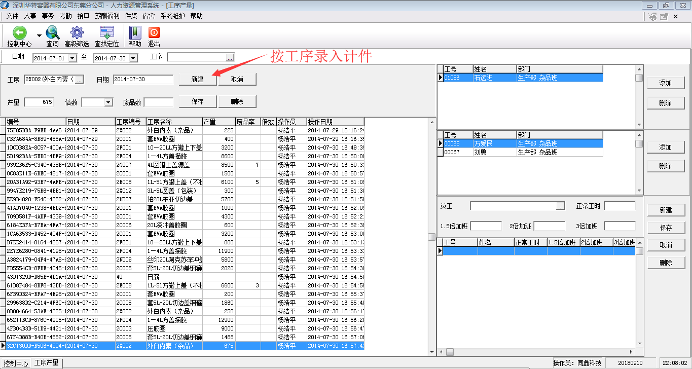 妙用之一,定制了按工序錄入每日計件資料,實現(xiàn)按每日工序的產(chǎn)量計算計件工資,輕松解決繁瑣工序產(chǎn)量多、節(jié)假日出勤的倍數(shù)及廢品數(shù)核算難的問題等,如下;
