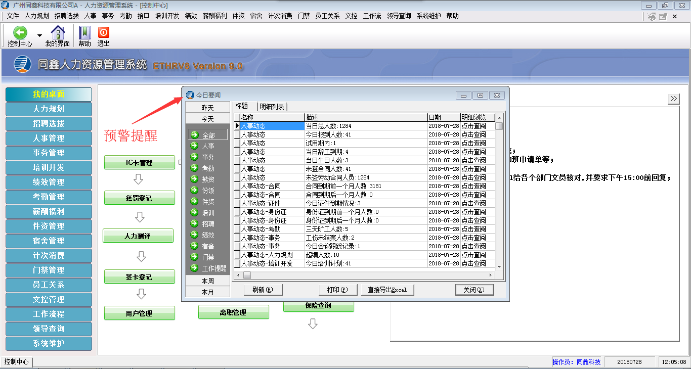 如上所示,用戶一登錄系統(tǒng),即彈出預(yù)警提醒與人文關(guān)懷結(jié)合的信息,如當(dāng)天總?cè)藬?shù),當(dāng)天報到人數(shù),當(dāng)天辭工到期人員,當(dāng)天生日人數(shù),當(dāng)天入職紀(jì)念日人數(shù)以及未簽勞動合同人數(shù)、未投保人數(shù),合同證件到期人數(shù)等,預(yù)警提醒信息可以依據(jù)客戶需求自定義,雙擊即可查找或?qū)С雒骷?xì),一目了然。