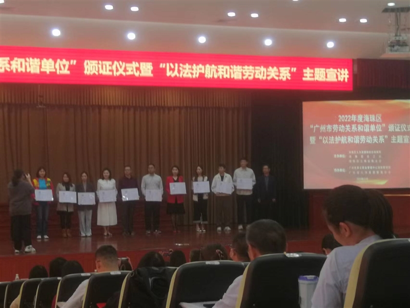 2023-11-21 16:08:12 瀏覽:1416 咨詢電話:400-1800-278近日,廣州市人力資源和社會保障局、廣州市總工會、廣州市企業(yè)聯(lián)合會/企業(yè)家協(xié)會、廣州市工商業(yè)聯(lián)合會公布了2022年度廣州市勞動關(guān)系和諧企業(yè)名單,同鑫公司應(yīng)邀參加了2022年度海珠區(qū)“廣州市勞動關(guān)系和諧單位“頒證儀式,并榮獲”廣州市勞動關(guān)系和諧企業(yè)”稱號。