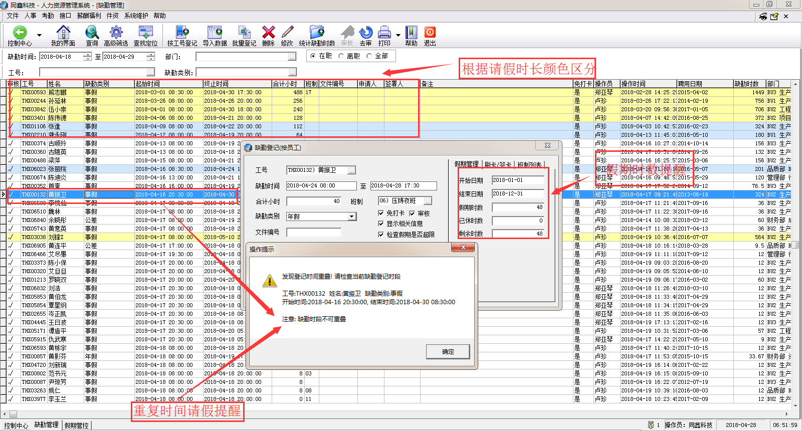 2、在請(qǐng)假控制方面,可以根據(jù)員工的請(qǐng)假時(shí)長(zhǎng)設(shè)定不同的顏色進(jìn)行區(qū)分,同時(shí)針對(duì)于不同的請(qǐng)假類別以及重復(fù)的請(qǐng)假輸入進(jìn)行控制,做到防呆提醒功能,以減少HR管理者請(qǐng)假事務(wù)性工作的出錯(cuò)率。